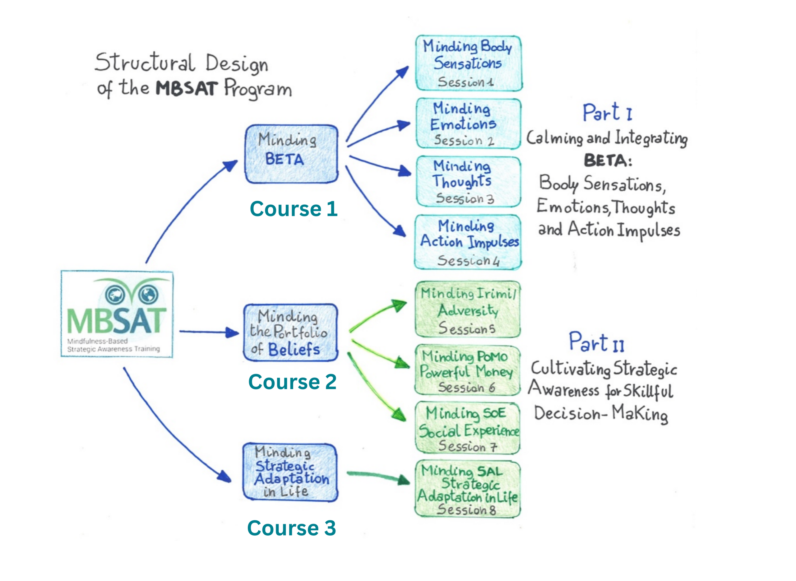 To facilitate your orientation and help you navigate from module to module an excellent start is the comprehensive overview of the Program Structure below that is also on the MBSAT website. It contains a graphic, concise descriptions of each component.